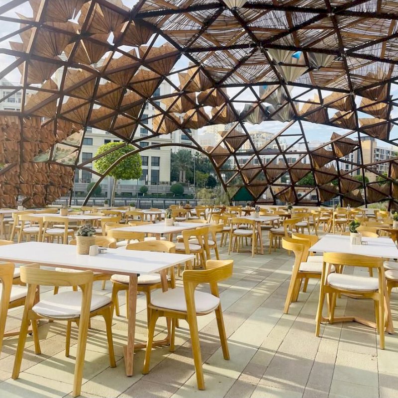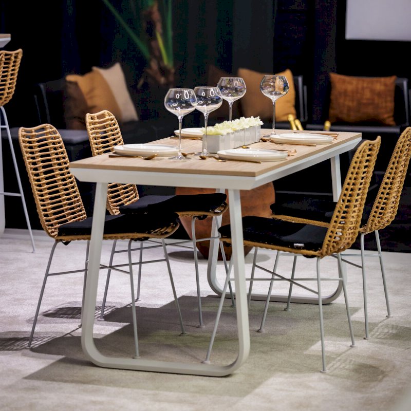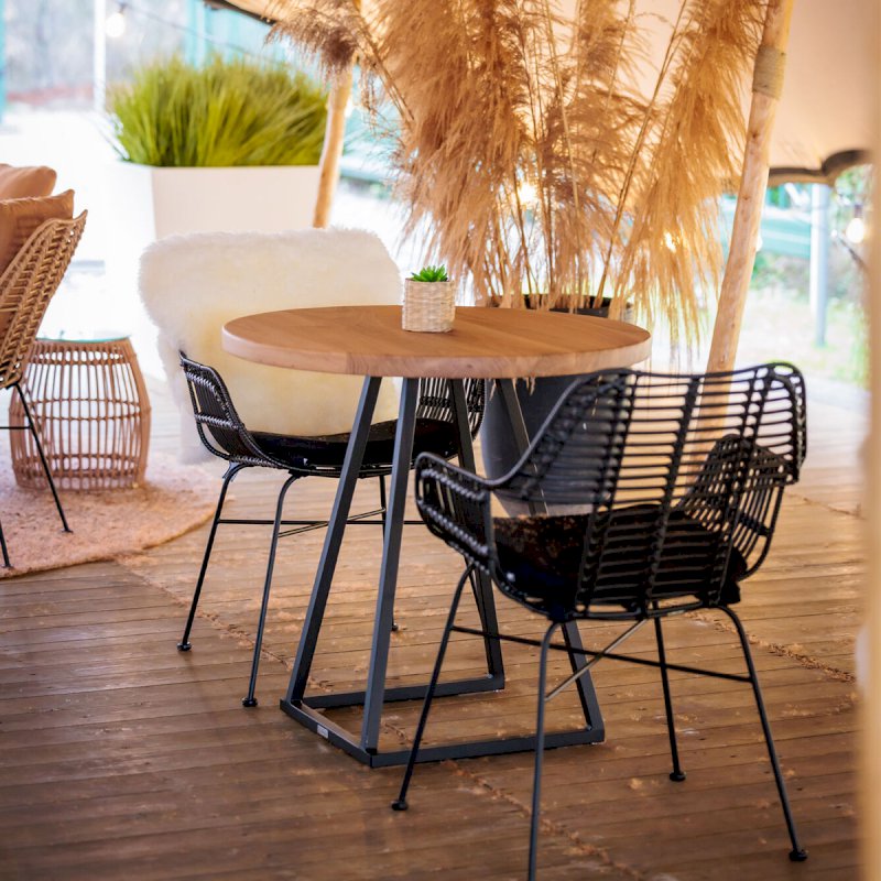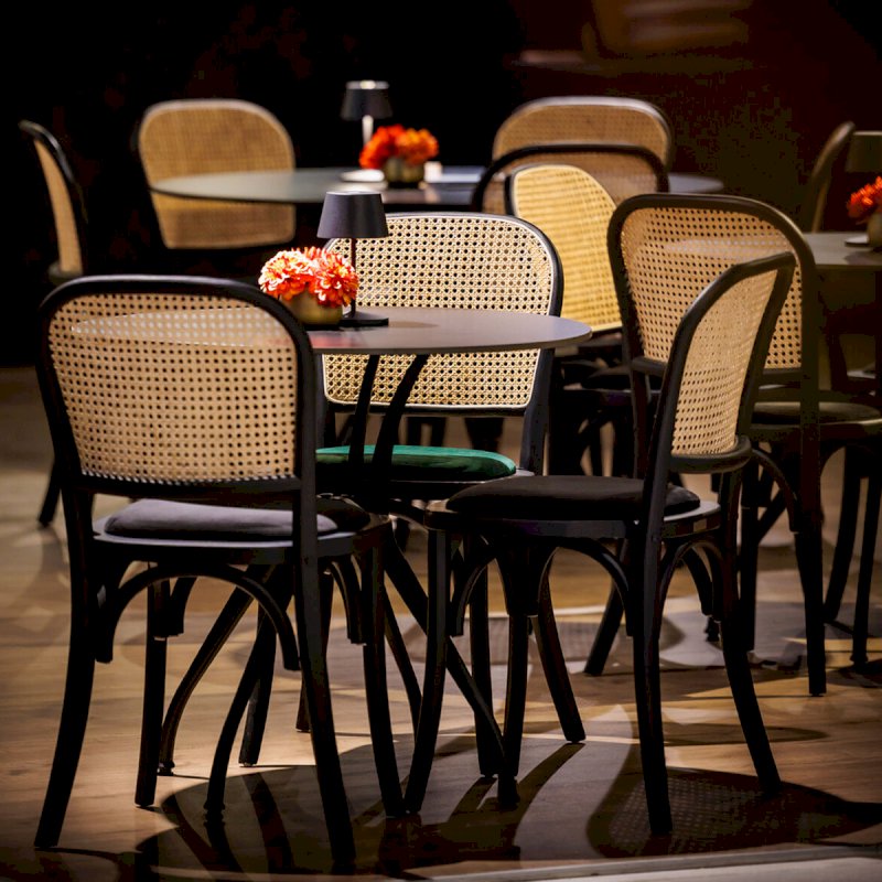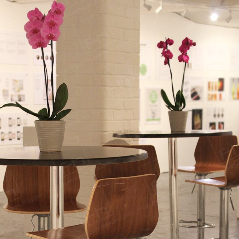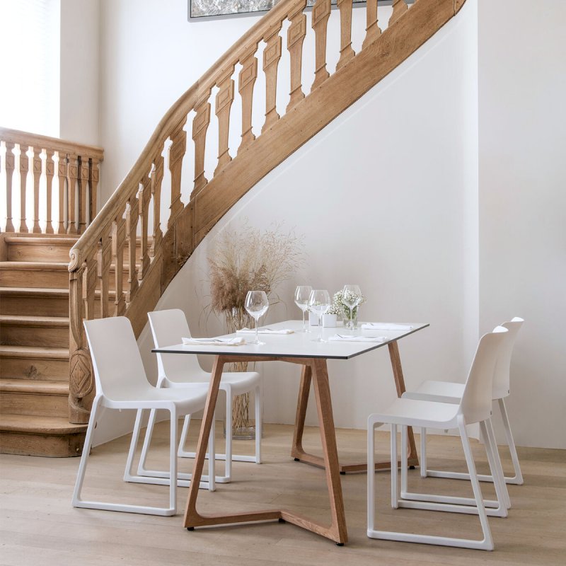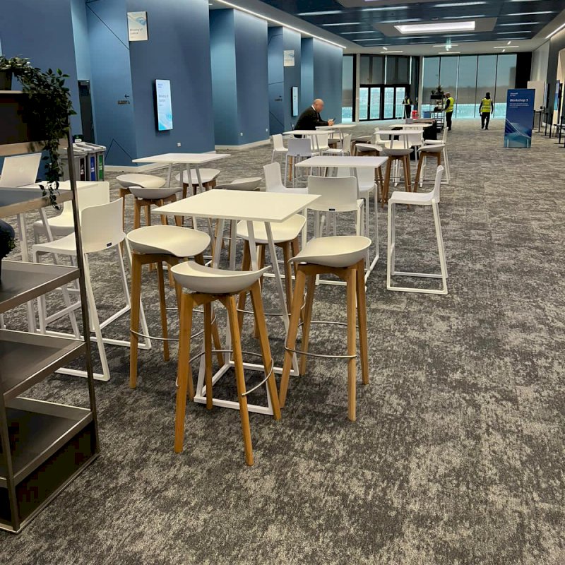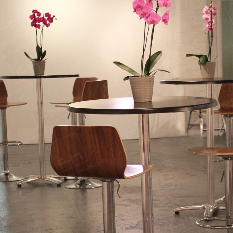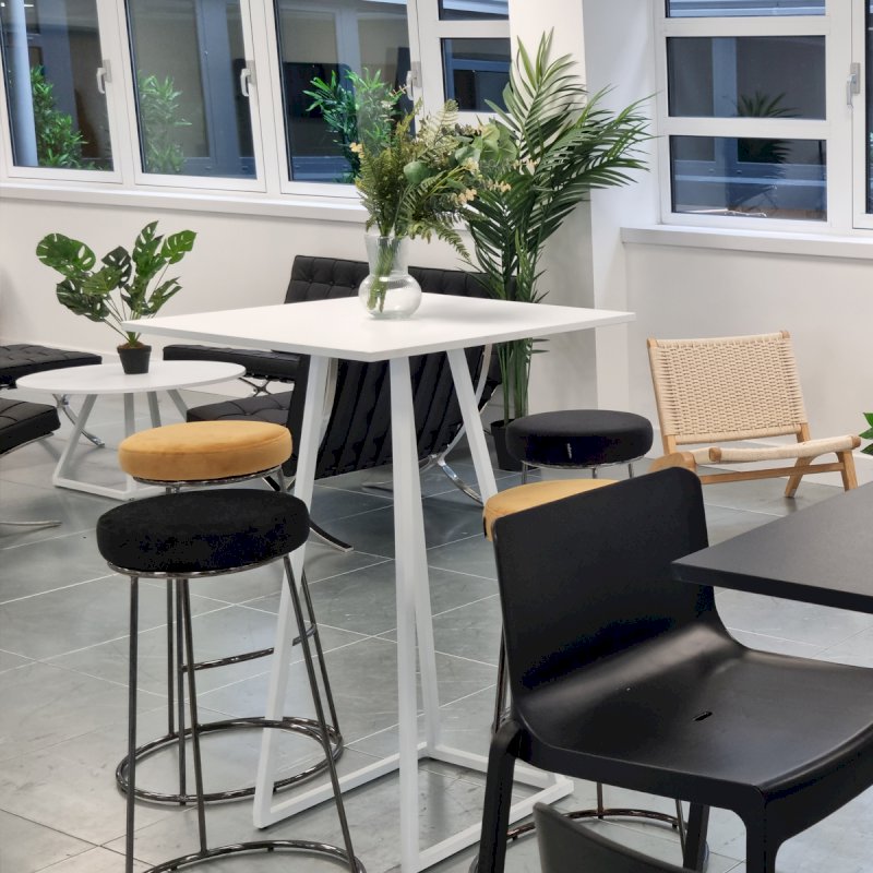 Our tavola tables are simple but effective in any space or environment. Teamed with Esme stools with low back.